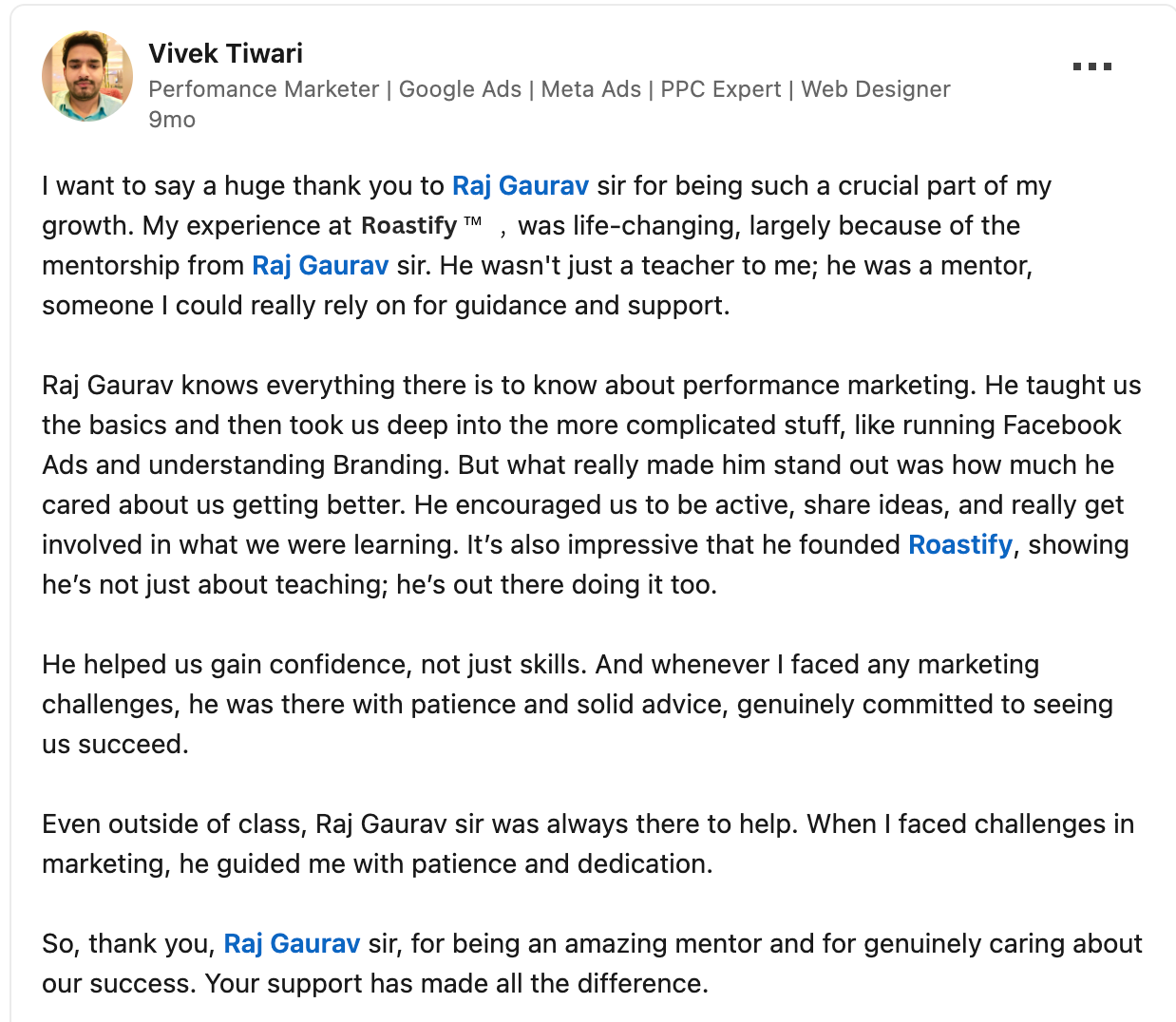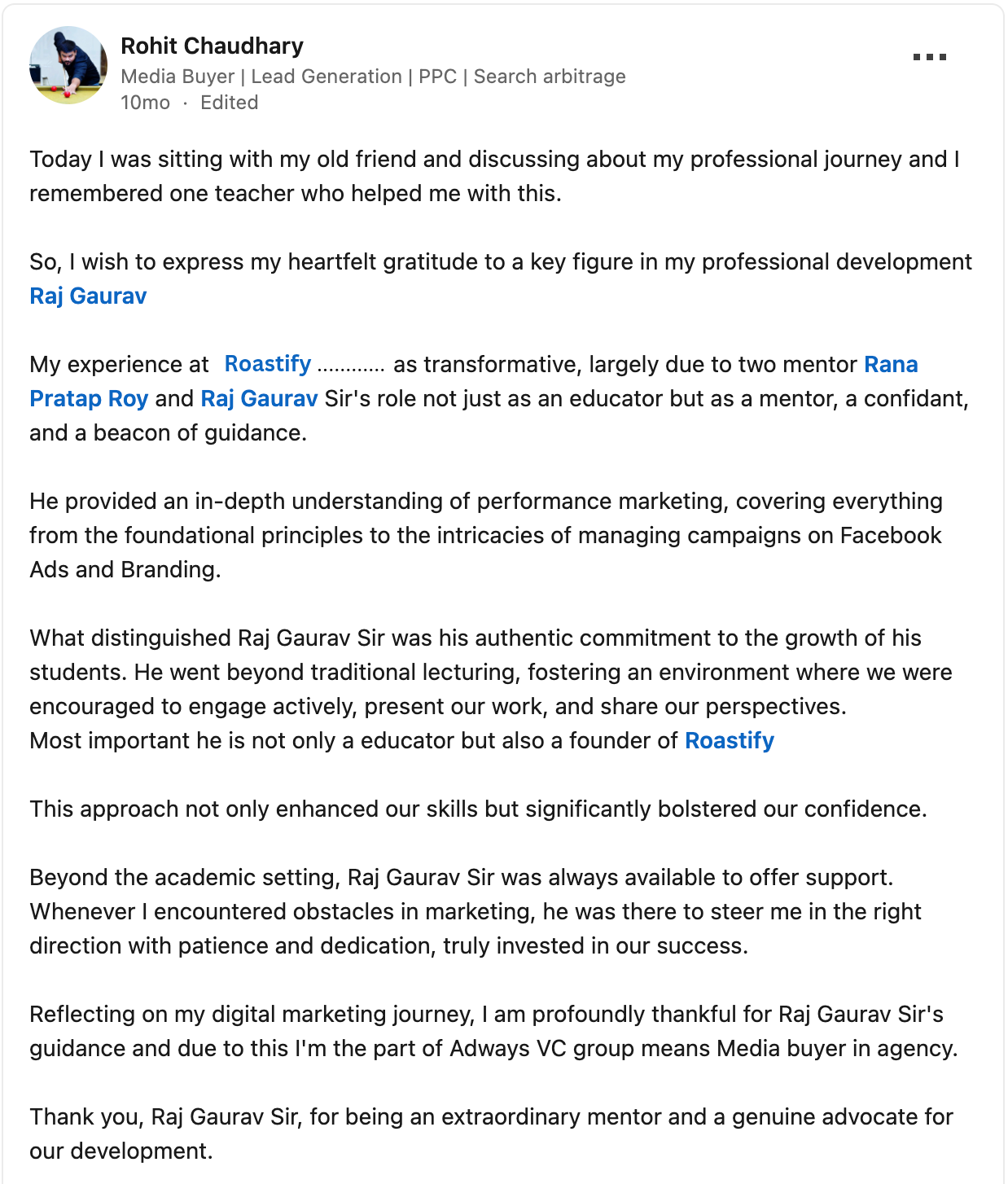 Raj Gaurav, Founder & CEO of Roastify Agency and a seasoned performance marketer with over 6 years of expertise in scaling D2C brands through Meta Ads.