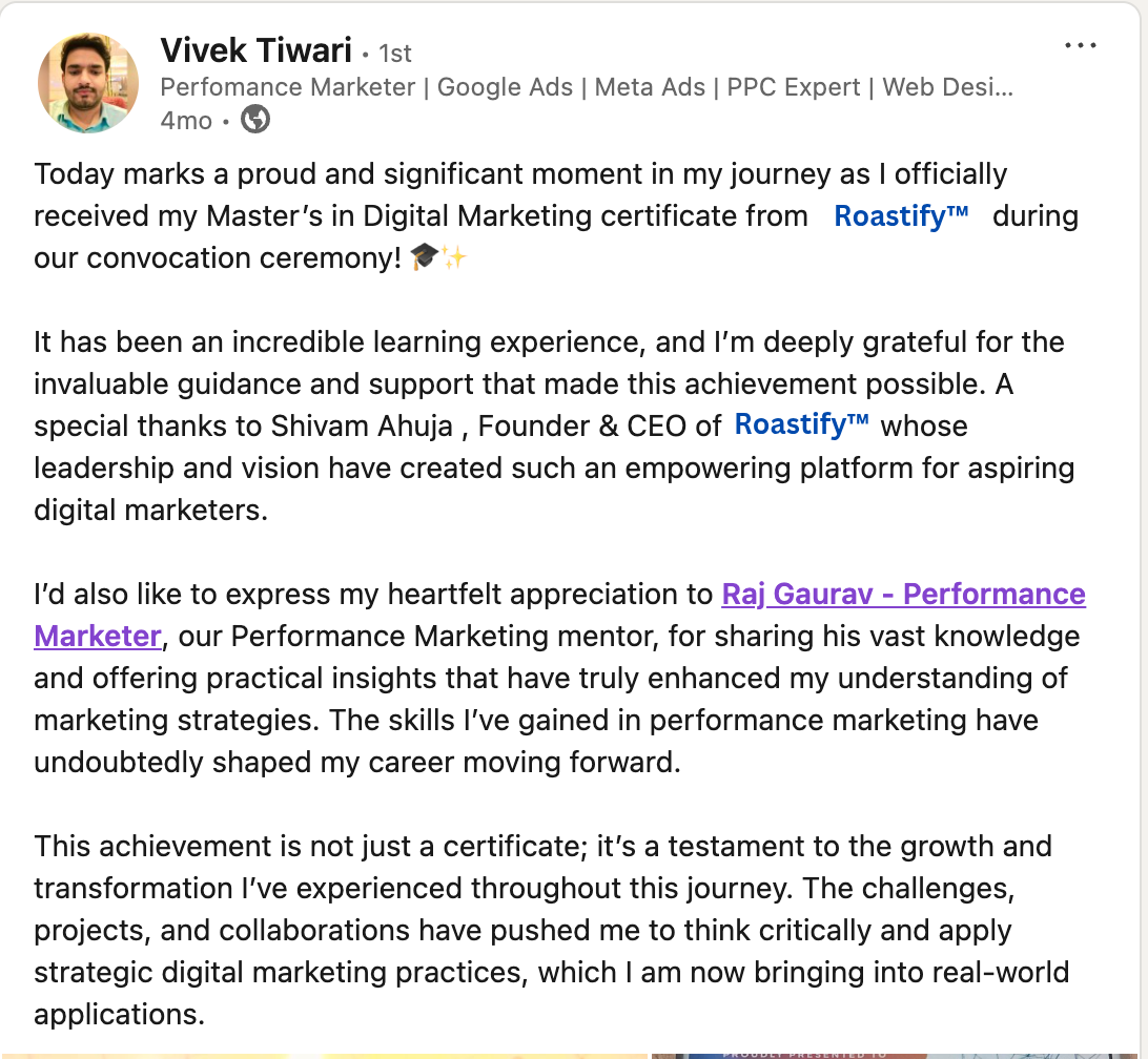 Under his leadership, Roastify has driven exceptional growth for 150+ brands, managing over ₹10 crore in ad spend while achieving remarkable ROAS. A passionate educator, Raj has trained 500+ students, equipping them with the skills to excel in digital marketing. An alumnus of MICA, Indiaʼs top marketing institute, Raj combines academic excellence with real-world insights.